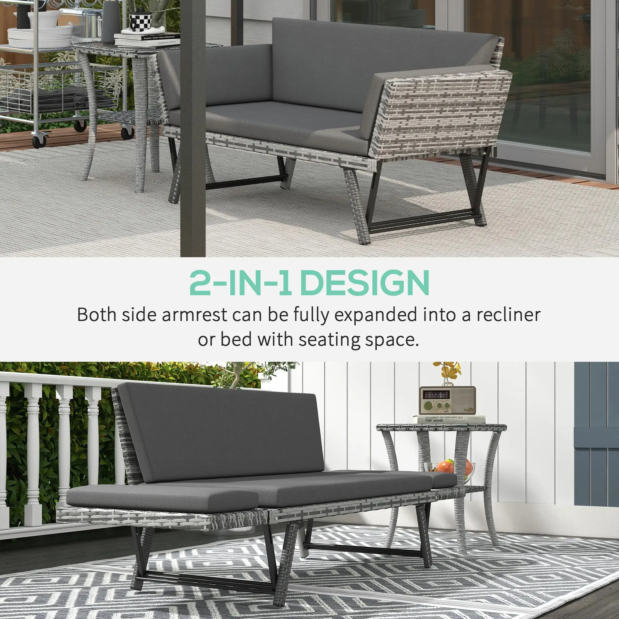 2-Seater Mixed Grey Rattan Sofa with Cushions, Adjustable Armrests – Outdoor Chaise Lounger, Garden Patio Daybed Loveseat