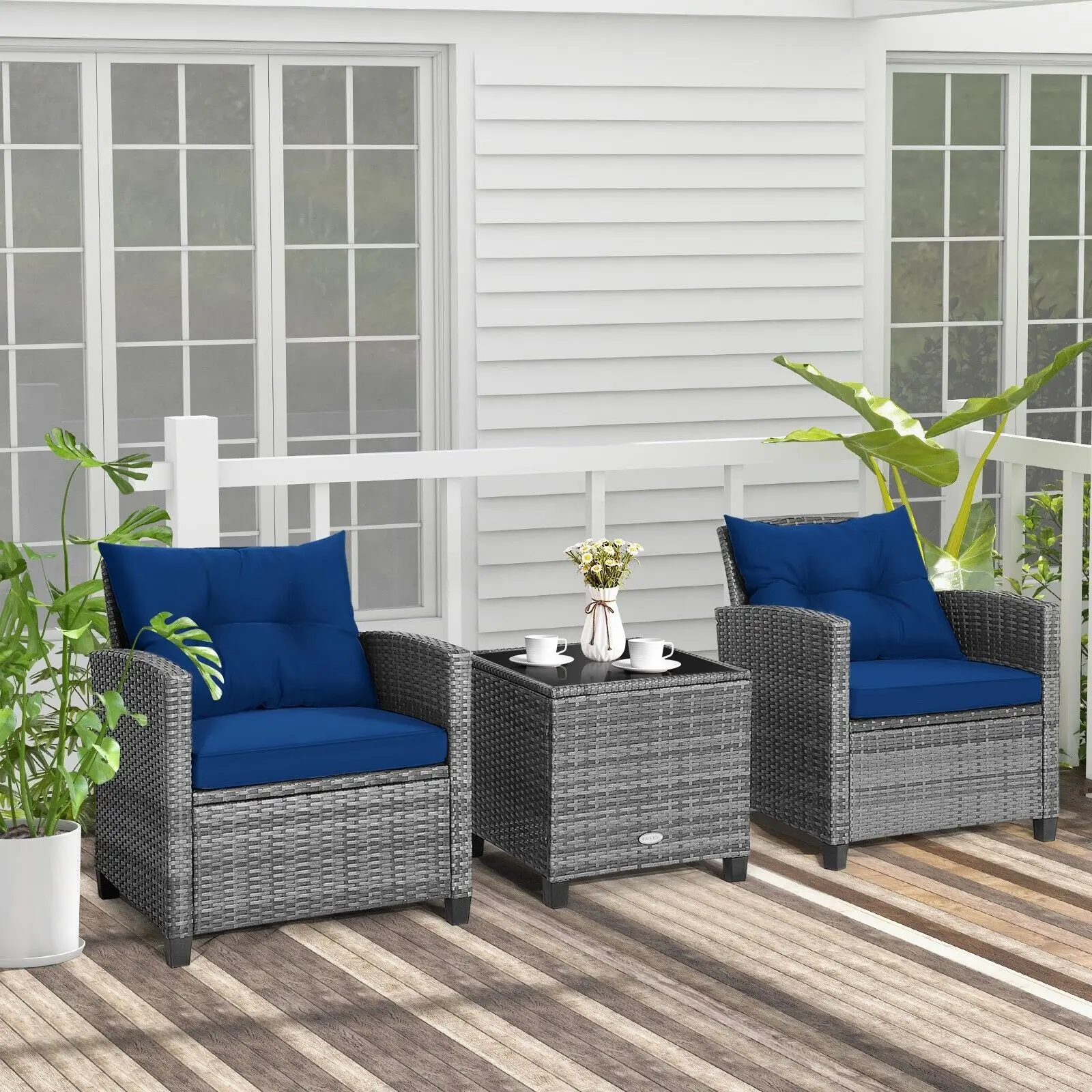 Built with a strong steel frame and durable PE rattan, this set ensures long-lasting stability and weather resistance. The compact coffee table, topped with smooth tempered glass, provides a convenient surface for drinks and snacks. Ideal for your backyard, garden, balcony, or poolside, this stylish wicker conversation set combines comfort, durability, and elegance.