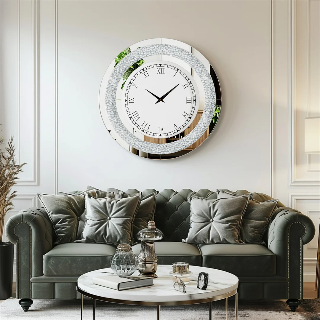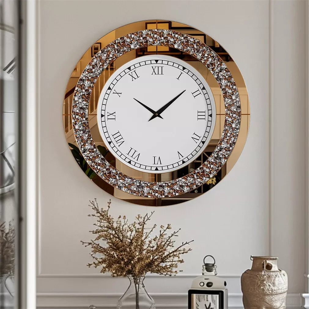 This elegant wall clock showcases a dazzling inlay of sparkling silver or tawny-tinted crushed diamonds, framed by sleek beveled glass edges. The combination of reflective materials and shimmering details creates a stunning, eye-catching centerpiece that adds a touch of glamour to any room.
