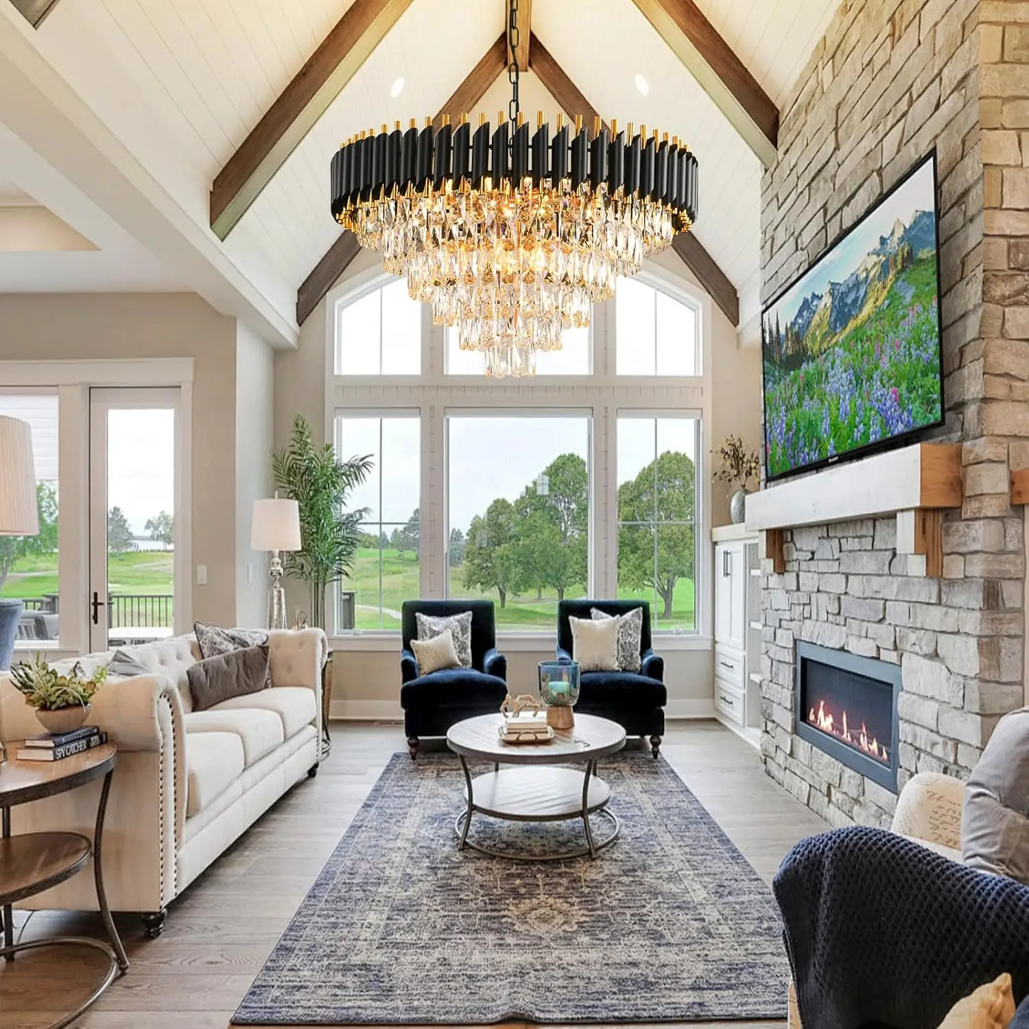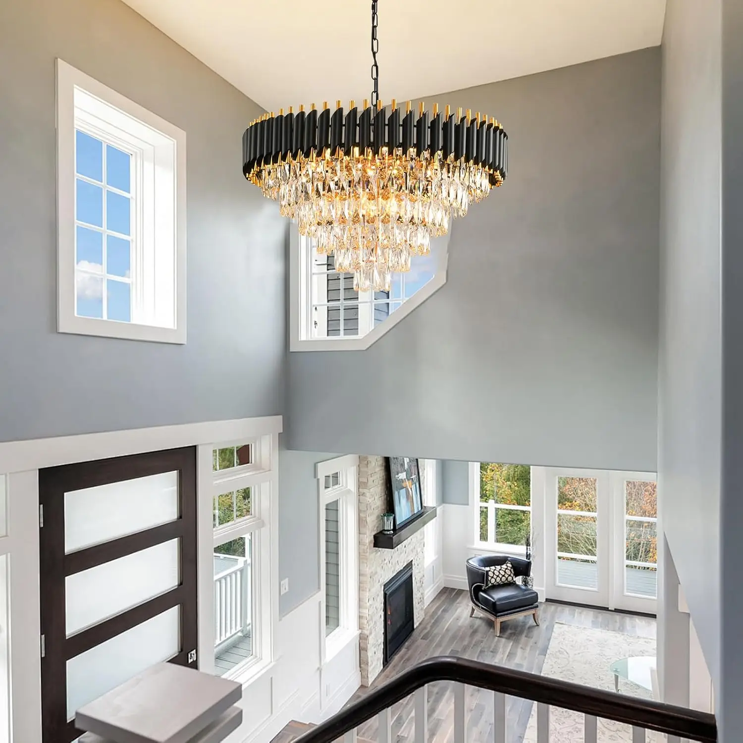 Gold 6-Tier Modern Crystal Chandelier, Large Round Black Fixture for Dining & Living Room