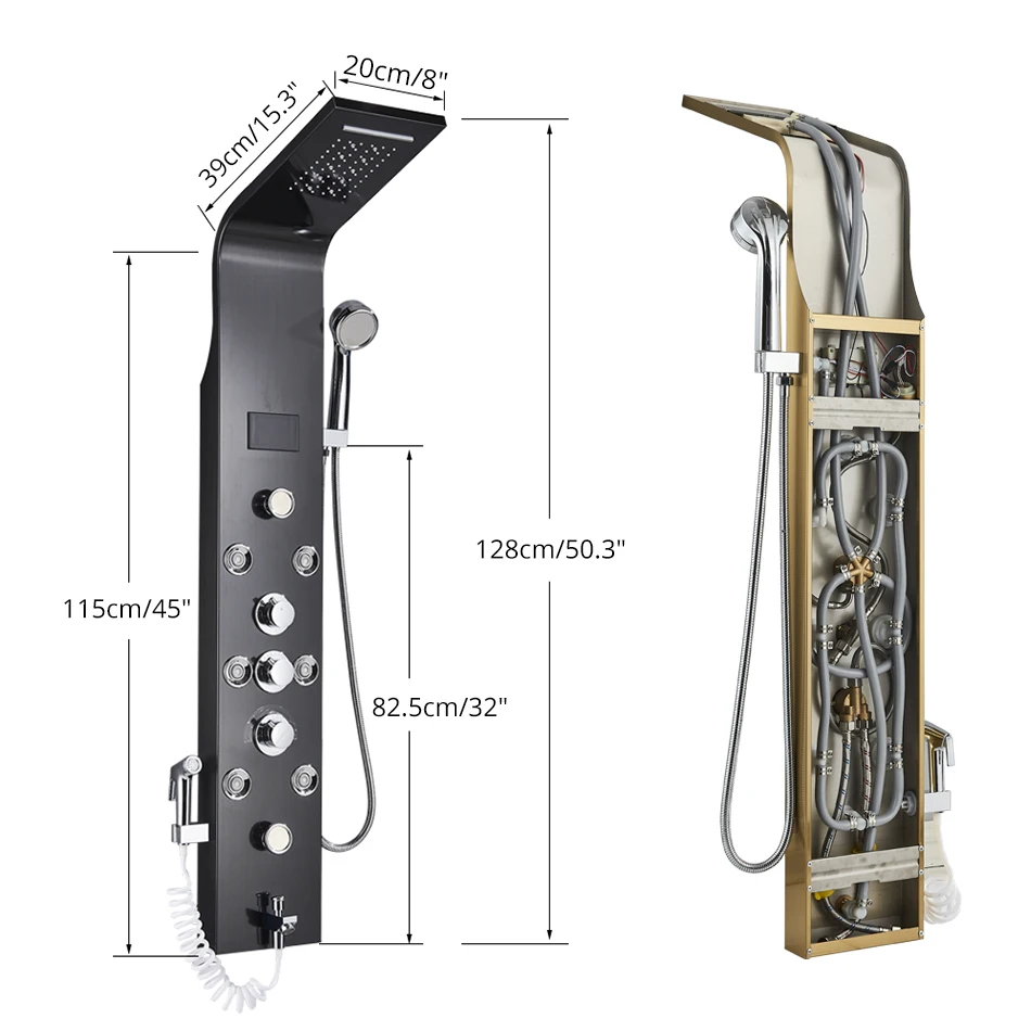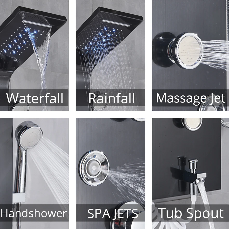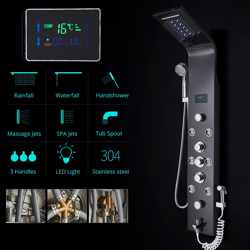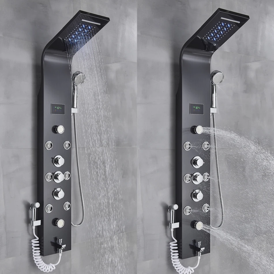 Luxury LED Rainfall Shower Panel System, Black/Brushed Finish Bathroom Faucet with Massage Jets, Bathtub Mixer, and Temperature Screen