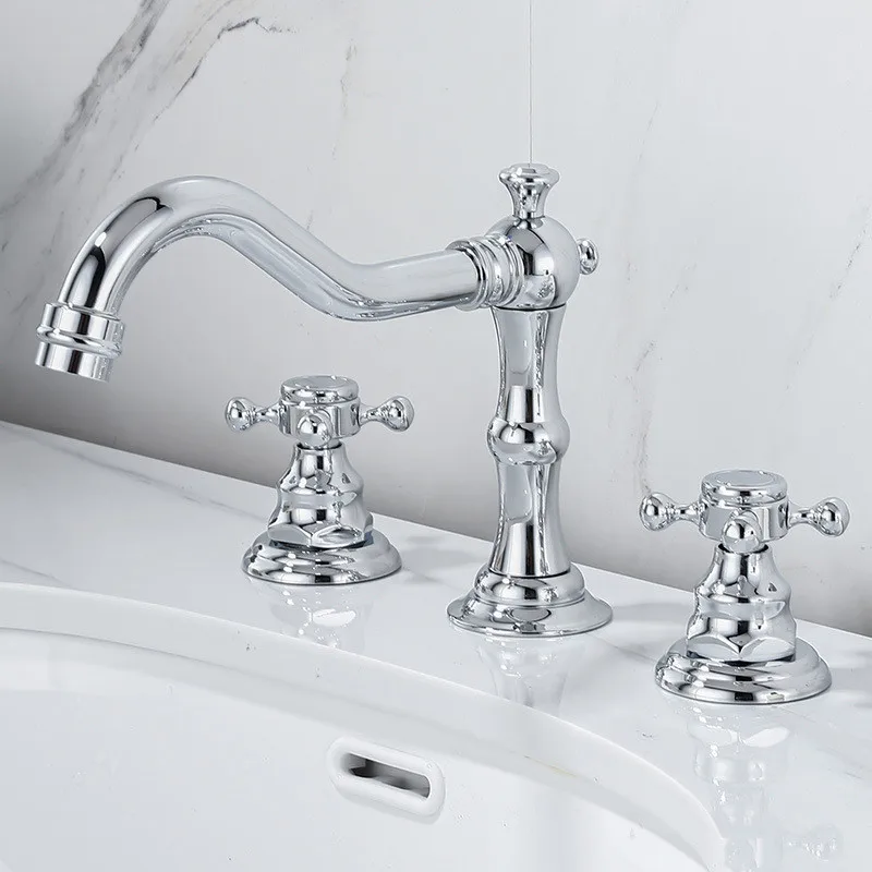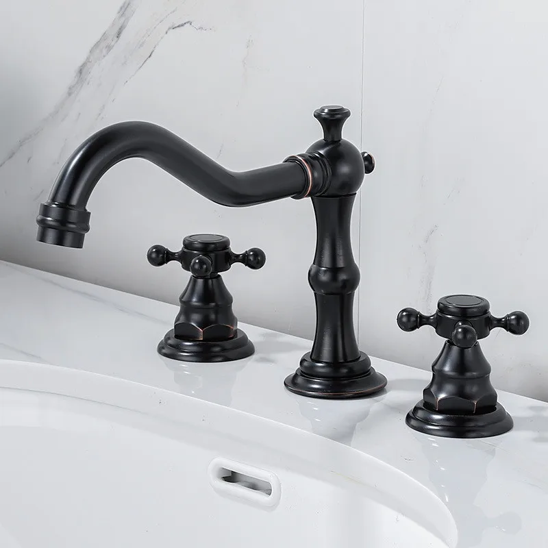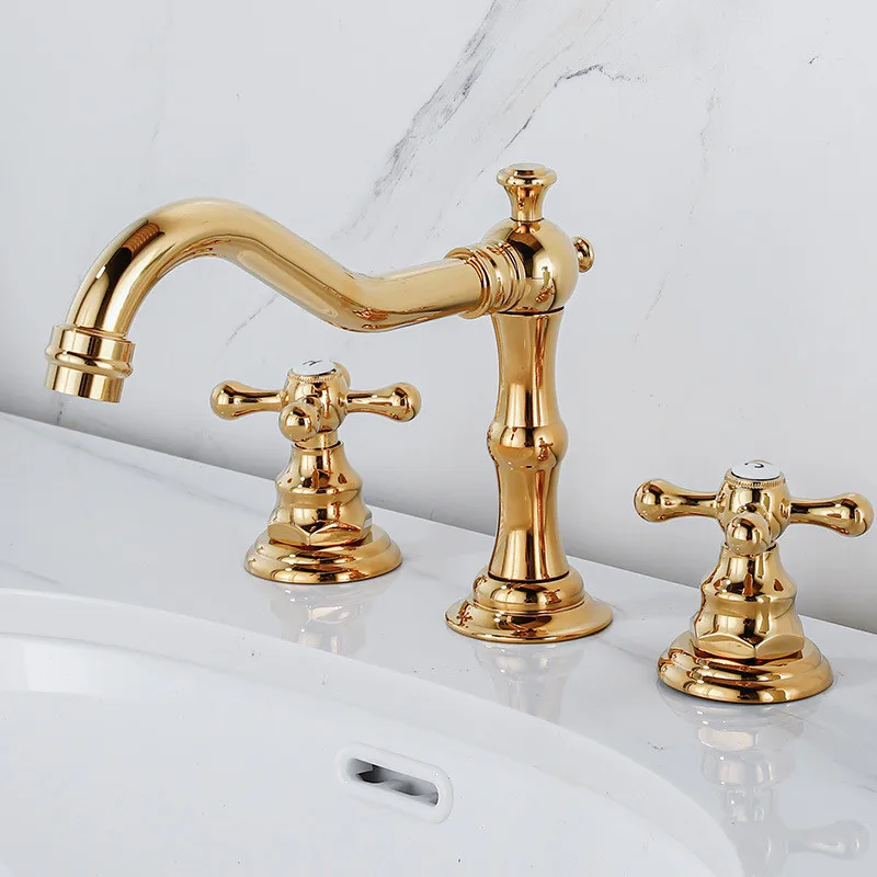 Tuqiu Antique Brass Bathroom Faucet – Gold 3-Hole Basin Mixer Tap with Double Handles for Hot & Cold Water